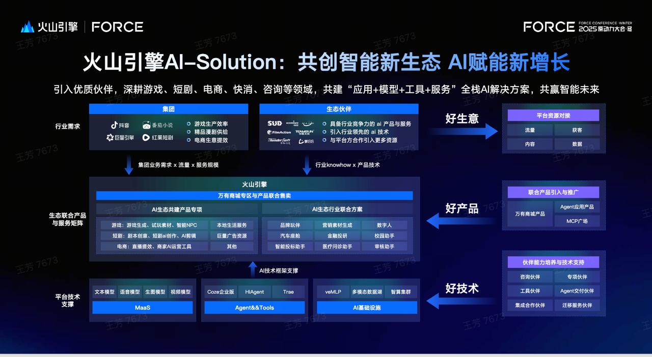 为此,火山引擎推出 AI-Solution 解决方案,重点聚焦游戏、电商、短剧、金融、汽车、通用等核心赛道,与生态伙伴一同共研好技术、共建好产品、赋能好生意。